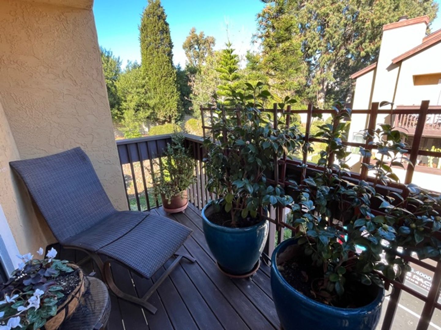 Three balconies with large flowering shrubs